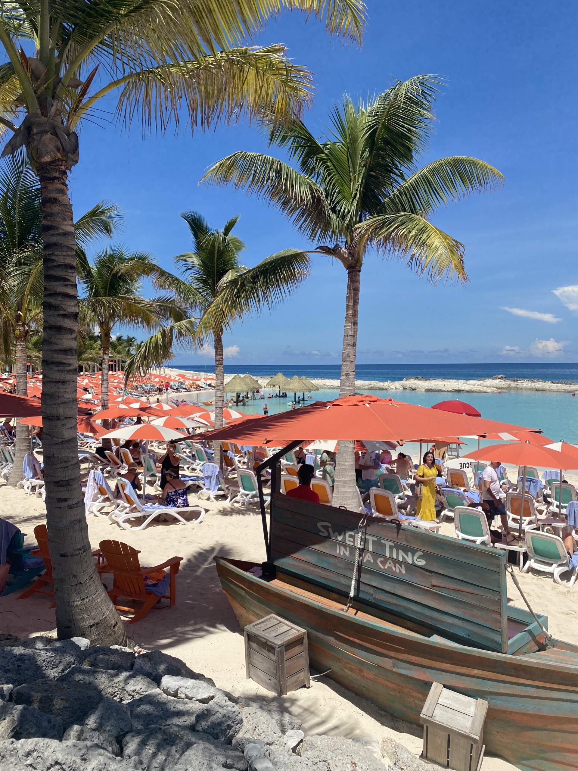 For adults, there’s Hideaway Beach, an adults-only oasis with a massive infinity pool, swim-up bars, live music, and beachside cabanas. It’s a full-on party-meets-relaxation hybrid, and it was one of the most unexpectedly fun days of the entire trip. We spent the day here, noshing on coconut shrimp and drinking piña coladas in hammocks over the water.