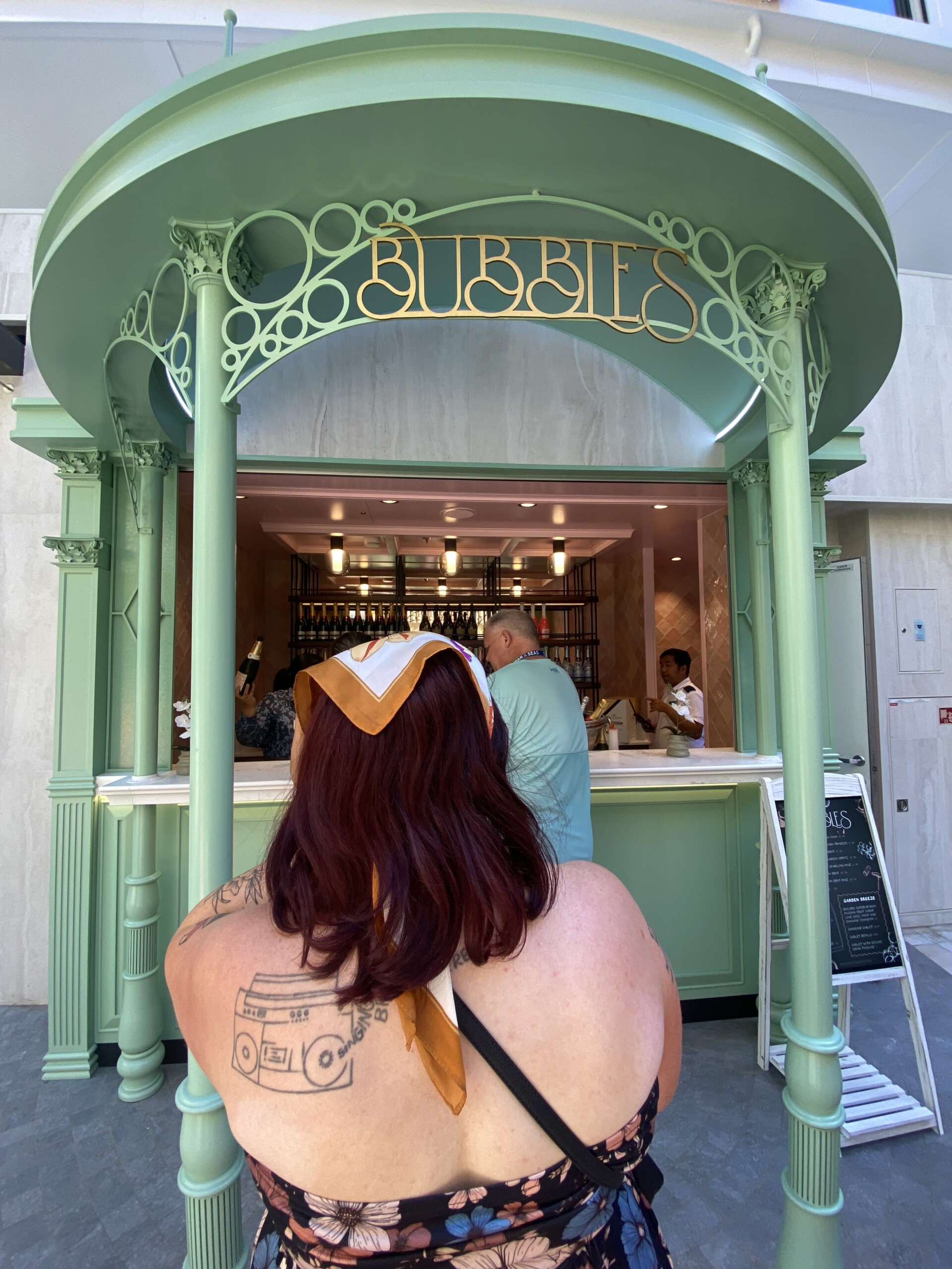 The Pearl Café was our first stop: a wide-open, 24-hour café serving sandwiches, quick bites, desserts, and Starbucks coffee. With ample seating next to floor-to-ceiling windows spanning two stories, guests can refuel and take in the views before the ship even leaves port. The chairs were comfortable, the vibe was relaxed, and the people-watching was elite.