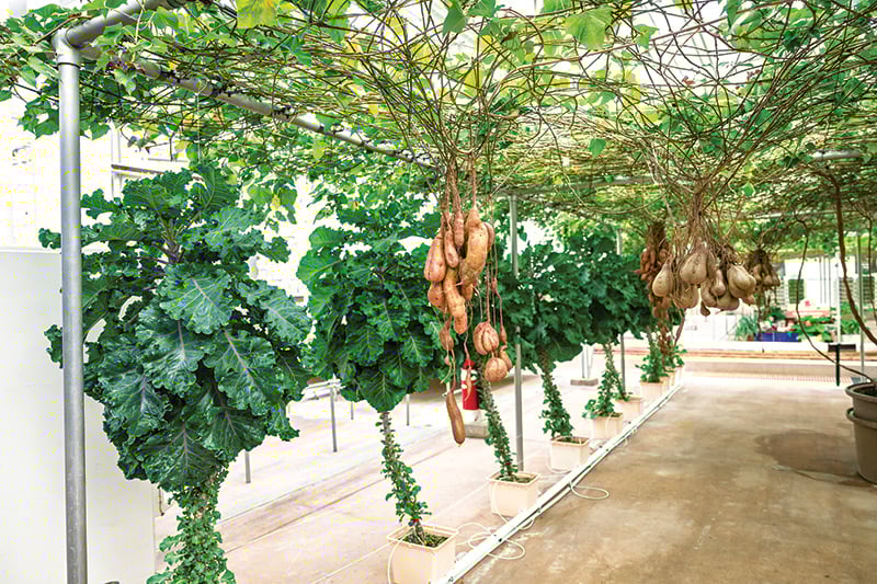 How does the team decide which crops or plants to feature in the greenhouses? How often do they rotate or change them?